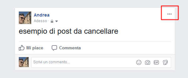 Per eliminare un post su Facebook sono necessari soltanto pochi passaggi. Vado sul post che voglio eliminare e clicco sull'icona con tre punti orizzontali in alto a destra.